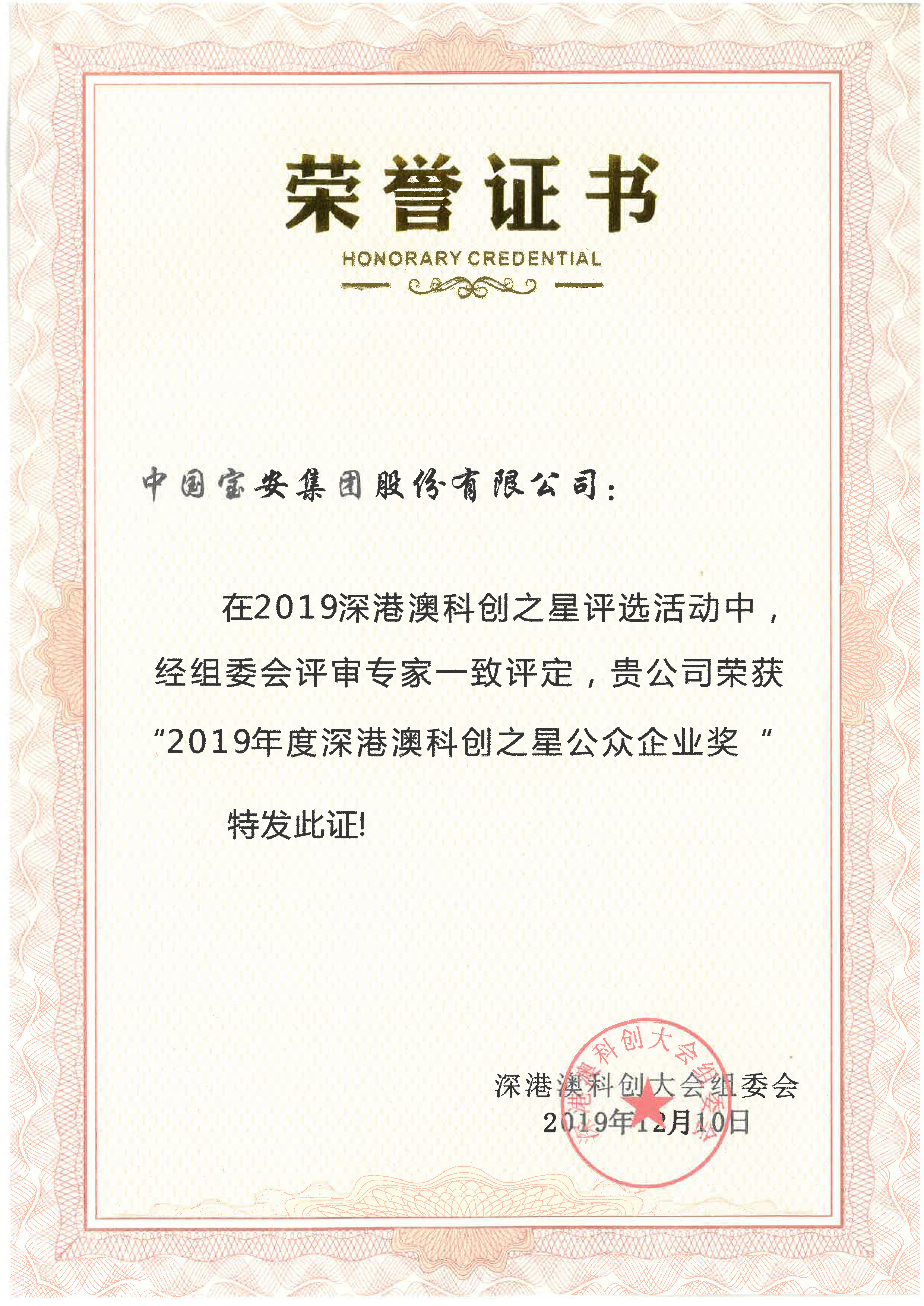 12月10日,2019年深港澳科创大会暨科创之星颁奖典礼在深圳召开,集团荣获科创之星公众企业奖。